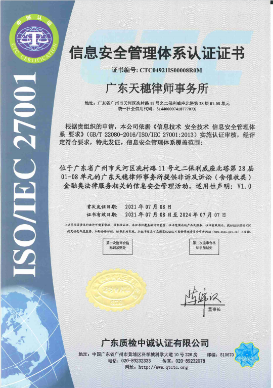 经过一系列严格的审查考核,广东天穗律师事务所顺利通过CB/T 22080-2016/ISO/IEC27001:2013信息安全管理体系认证和审核,并于2021年7月8日获得了CB/T 22080-2016/ISO/IEC27001:2013信息安全管理体系认证证书。本次认证的通过,标志着我所在提供非诉及诉讼(含催收类)金融类法律服务相关的信息安全管理活动上又上了一个新台阶,同时,也是对“广东天穗”律所品牌与信誉的再次肯定!